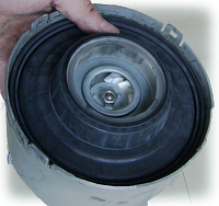 And this is what is underneath. It is a large, circular rubber contruction that seals around the edge, on a metal surface below and on the surface above. Lift this out and put it to one side. |