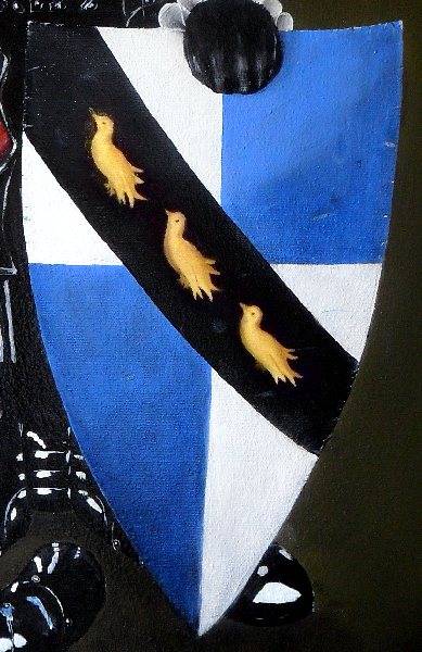 The Grosse coat of arms - from the 'Roll of Arms of the Reign of Edward the Second'; 'Le Gros, quartile de argent e de azure, a une bende de sable e iij merelos de or' - quarters of silver and blue and a diagonal black band with three gold blackbirds. |