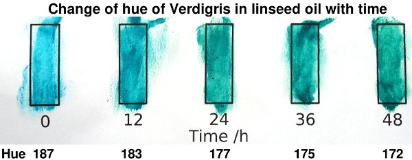 If you make up some verdigris paint and paint a sample, over a period of a few days, it will become more green as it dries. Jan van Eyck used