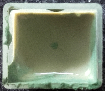 This is what the half-pan of our purified malachite pigment looks like before it has dried. It still