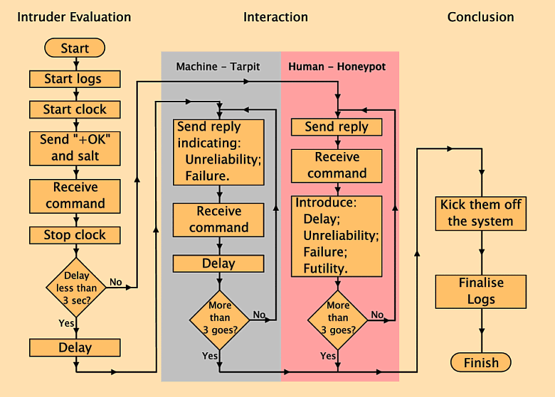When we get a response, we look at the time again and, as all we have to go on is the amount of time it has taken them to respond - that is all we can use. If it is a machine, it will be fairly quick as it is automatic but if it is a human, it will take longer to type. We can set a threshold value for our decision which I have nominally set as 3 seconds but you could set this lower if you found that people were logging on with clients consistently quicker (say 2 seconds) and this could differentiate better between people with a client and people pasting a piece of text into telnet.