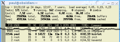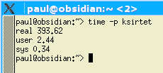 Once ksirtet has finished, time prints out the total elapsed time that the program has run from when it started to when it finished (in this case, 393.62 seconds or 6m33.62s), the amount of user time (2.44s) and the amount of system time (0.34s). If you add up these last two times, you get 2.78s which is reflected in the time that top came up with when it was running.