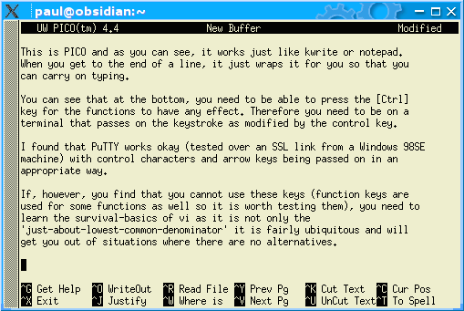 I have tried Pine and Pico over an SSL link from Windows using PuTTY and there are no problems with the way that the control key is transmitted. However, if there is a possibility of ending up with a link that will only use unmodified keyboard characters (ie, not [Ctrl], [Alt], [Meta], [Win/Tux] and so on) then you need to learn how to use the very basics of 'vi' (see above).
