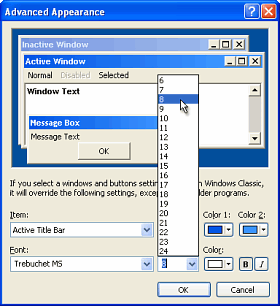 Then, select 'Active Title Bar' and reduce the size of the font and the size of the bar in the same way as you would for XP.