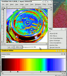 In the Gimp, you could HSV-decompose an image and put the V layer into the H layer then flood-fill the S layer with white and when you recompose, you get a false-colour image. However, although this works, it is not particularly flexible or dynamic - there is no way of optimising it in real time (you can mess around with the gamma and so on for the H layer but you have to do several steps to see the result).