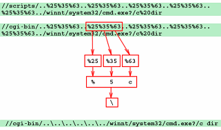 The hack on the right is based on ASCII codes for characters that normally are either not permitted in http addresses or, as they are here, being hidden so that any program that does the conversion once, will still not see what is intended.