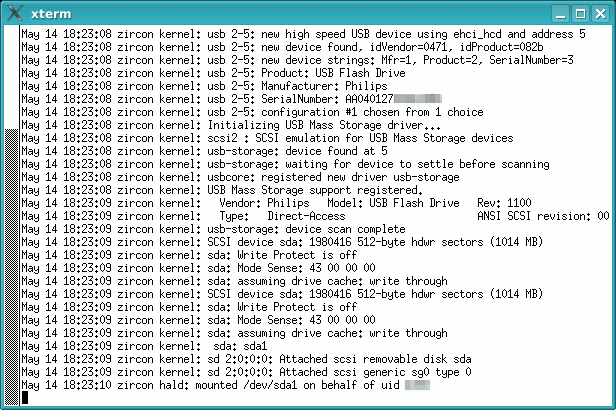 tail -f /var/log/messages... which will do pretty much the same thing on any system. Next, plug in the USB drive. With a normal drive that is formatted and recognised by the system, you should get something like the output in the screenshot above-right.